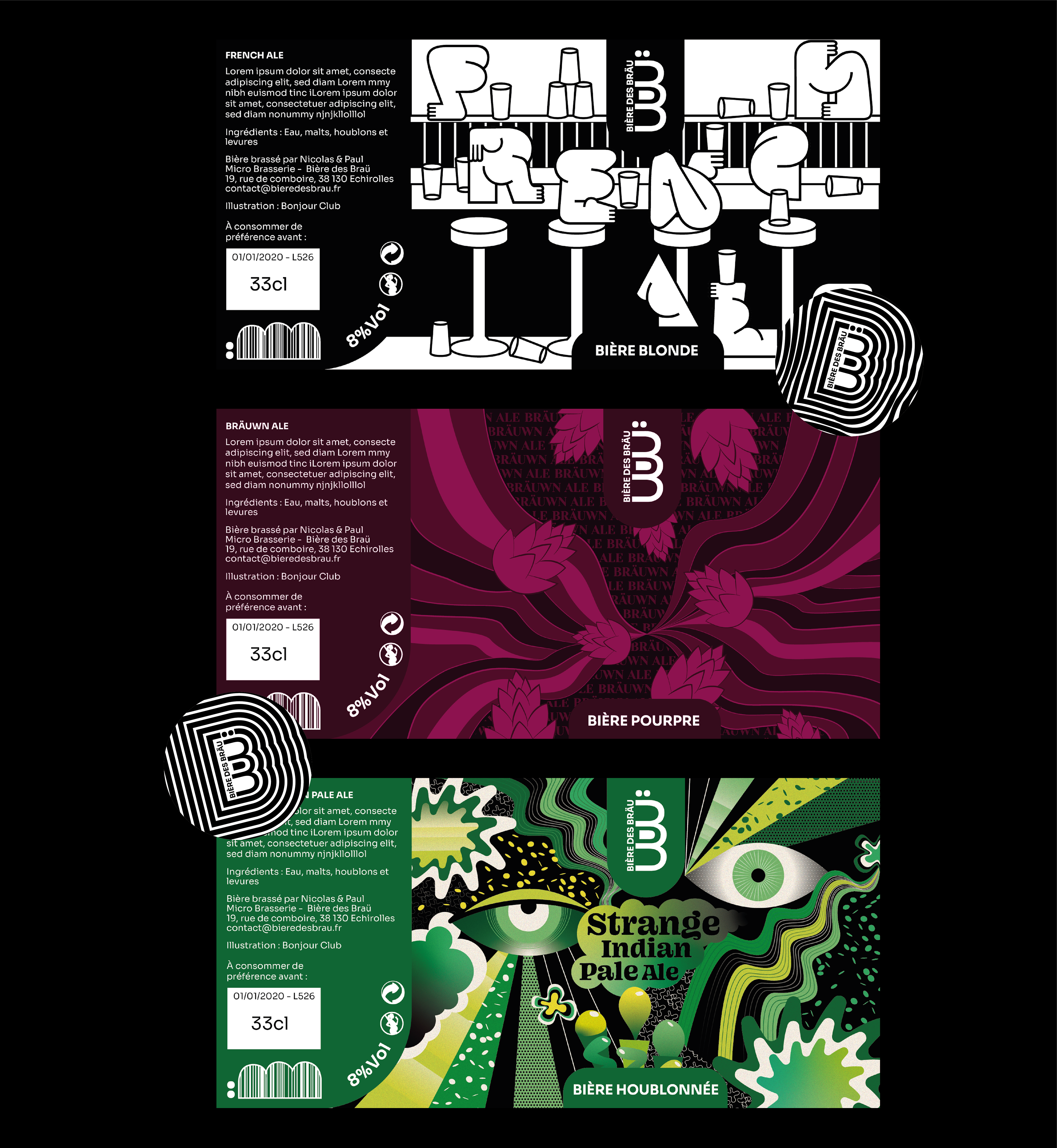 Avec le Bonjour Club, nous avons créé l'identité visuelle de la brasserie Bière des Brau située dans l'agglomération Grenobloise. Nous avons aussi travaillé sur les premières étiquettes de bouteille ainsi que leur verre.