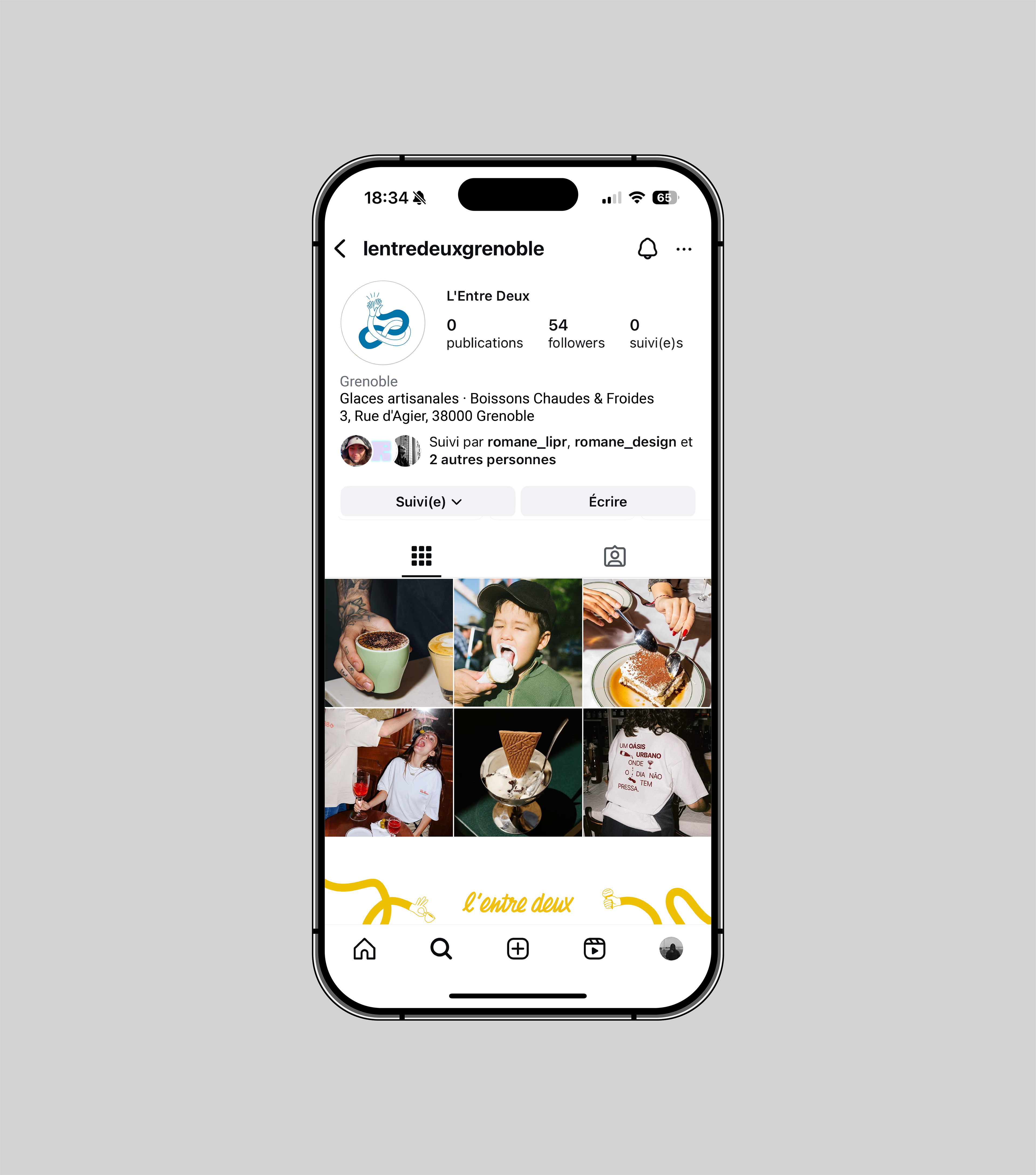 Avec le Bonjour Club, nous avons créé l'identité visuelle de l'entre deux, un lieu ou prendre un cafés, une glaces, ou un goûter, à Grenoble.